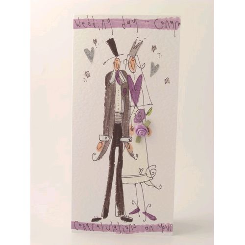 Hand Finished Wedding Card in Purple with a Bride & Groom design 21cm by 10cm